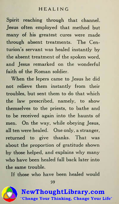Spirit reaching through that channel. Jesus of ten employed that method but any of his greatest cures were made through absent treatments. The Centurion's servant was healed instantly by the absent treatment of the spoken word. and Jesus remarked on the wonderful faith of the Roman soldier.