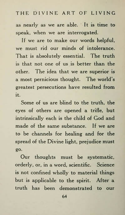 Some of us are blind to the truth, the eyes of others are opened a trifle, but intrinsically each is the child of God and made of the same substance. If we are to be channels for healing and for the spread of the Divine light, prejudice most go.