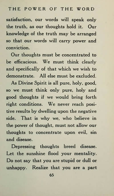 As Divine Spirit is all pure, holy, good, so we must think only pure, holy and good thoughts if we would bring forth right conditions. We never reach positive results by dwelling upon the negative side. That is why we, who believe in the power of thought, must nor allow our thoughts to concentrate upon evil. sin and disease.