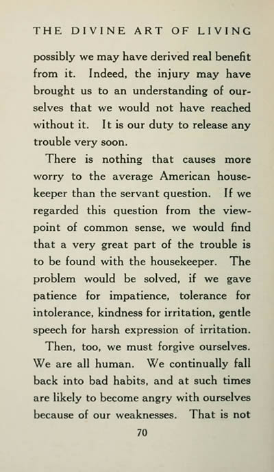 There is nothing that causes more worry to the average American housekeeper than the servant question. If we regarded this question from the viewpoint of common sense, We would find that a very great part of the trouble is to be found with the housekeeper. The problem would be solved, if we gave patience for impatience, tolerance for intolerance, kindness for irritation. gentle speech for harsh expression of irritation.