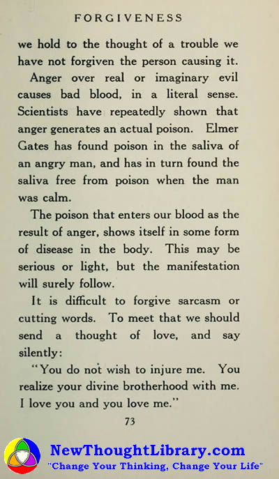 Anger over real or imaginary evil causes bad blood, in a literal sense. Scientists have repeatedly shown that anger generates an actual poison. Elmer Gates has found poison in the saliva of an angry man. and has in turn found the saliva free from poison when the man was calm.