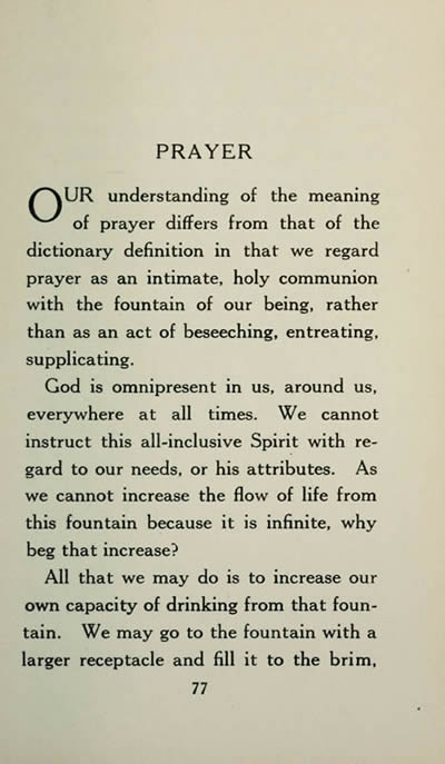 OUR understanding of the meaning of prayer differs from that of the dictionary definition in that we regard prayer as an intimate, holy communion with the fountain of our being, rather than as an net of beseeching. entreating, supplicating.