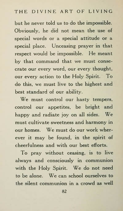 but he never told or to do the impossible. Obviously. he did not mean the use of special words or a special attitude or special place. Unceasing prayer in that respect would be impossible. He meant by that command that we most consecrate our every word, our every thought, our every action to the Holy Spirit. To do this, we must live to the highest and best standard of our ability.
