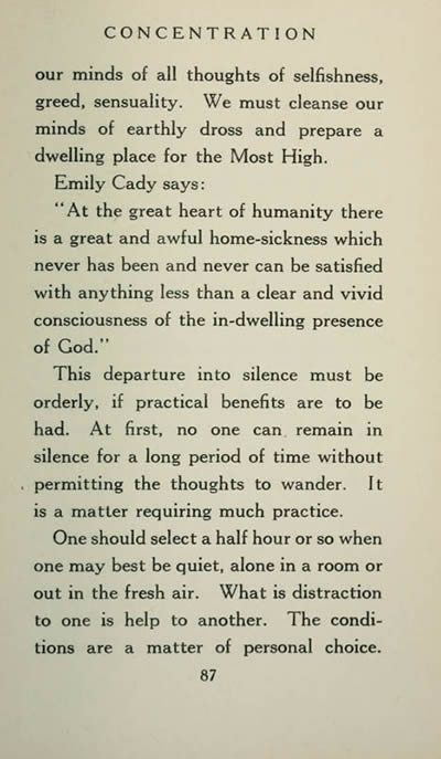 This departure into silence must be orderly, if practical benefits are to be had. At first, no one can remain in silence for a long period of time without permitting the thoughts to wander. It is a matter requiring much practice.
