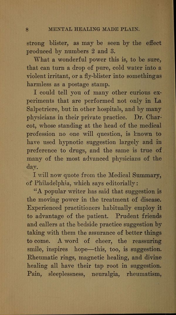 I could tell you of many other curious experiments that are performed not only in La Salpetriere, but in other hospitals, and by many physicians in their private practice. Dr. Charcot, whose standing at the head of the medical profession no one will question, is known to have used hypnotic suggestion largely and in preference to drugs, and the same is true of many of the most advanced physicians of the day.