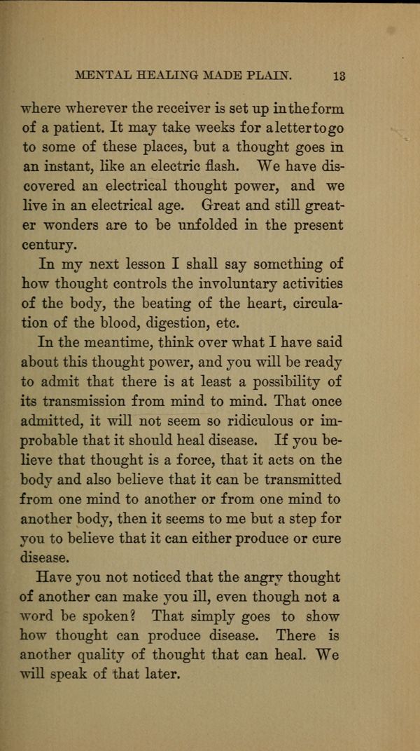 In the meantime, think over what I have said about this thought power, and you will be ready to admit that there is at least a possibility of its transmission from mind to mind. That once admitted, it will not seem so ridiculous or improbable that it should heal disease. If you believe that thought is a force, that it acts on the body and also believe that it can be transmitted from one mind to another or from one mind to another body, then it seems to me but a step for you to believe that it can either produce or cure disease.