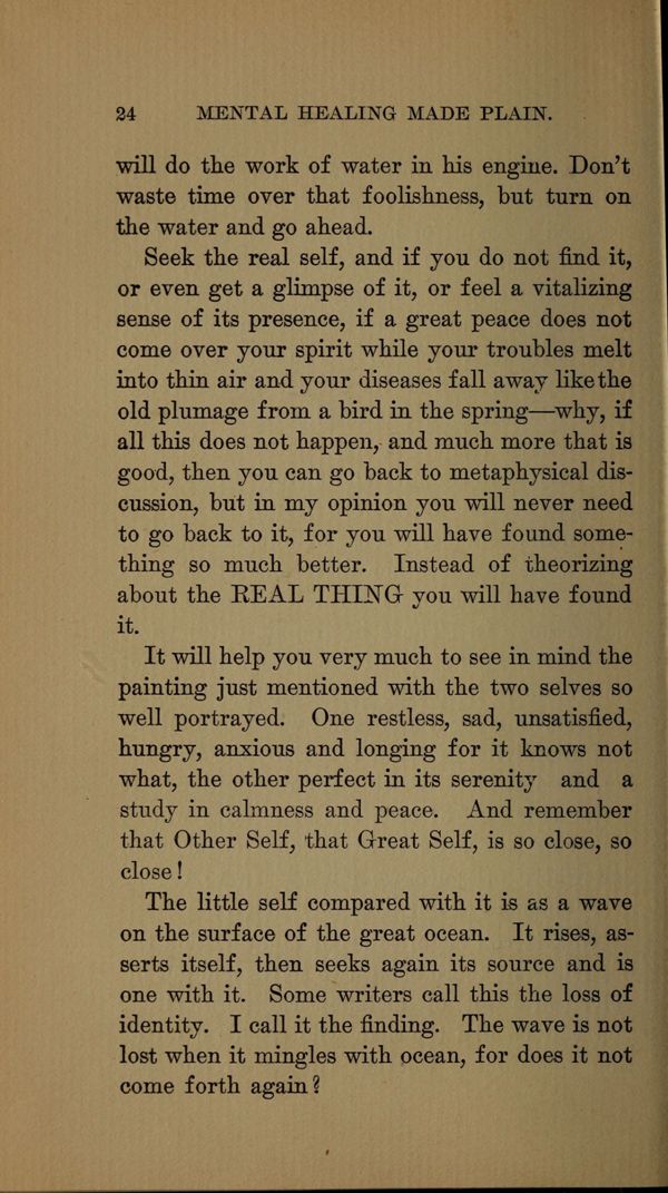 Seek the real self, and if you do not find it, or even get a glimpse of it, or feel a. vitalizing sense of its presence, if a great peace does not come over your spirit while your troubles melt into thin air and your diseases fall away like the old plumage from a bird in the spring -- why, if all this does not happen, and much more that is good, then you can go back to metaphysical discussion, but in my opinion you will never need to go back to it, for you will have found something so much better. Instead of theorizing about the REAL THING you will have found it.