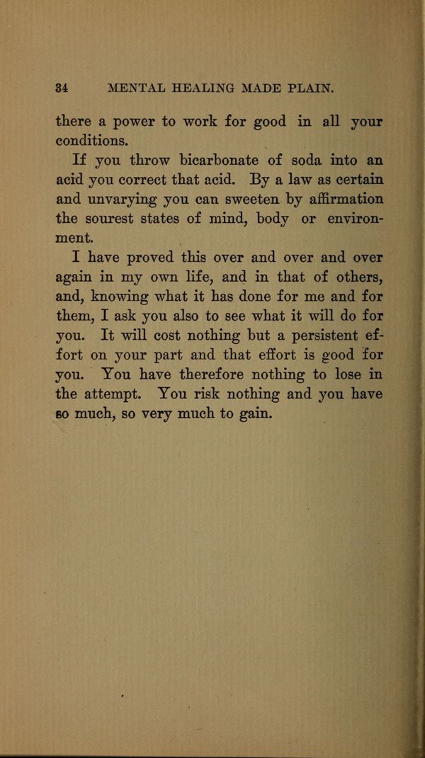 I have proved this over and over and over again in my own life, and in that of others, and, knowing what it has clone for me and for them, I ask you also to see what it will do for you. It will cost nothing but a persistent effort on your part and that effort is good for you. You have therefore nothing to lose in the attempt. You risk nothing and you have so much, so very much to gain.