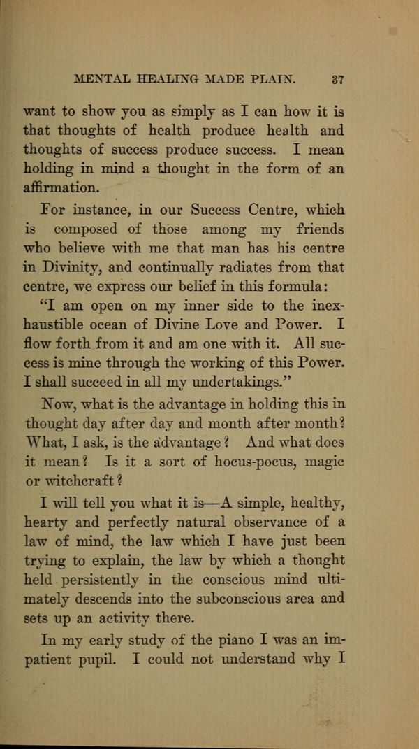 want to show you as simply as I can how it is that thoughts of health produce health and thoughts of success produce success. I mean holding in mind a thought in the form of an affirmation. For instance, in our Success Centre, which is composed of those among my friends who believe with me that man has his centre in Divinity, and continually radiates from that centre, we express our belief in this formula: