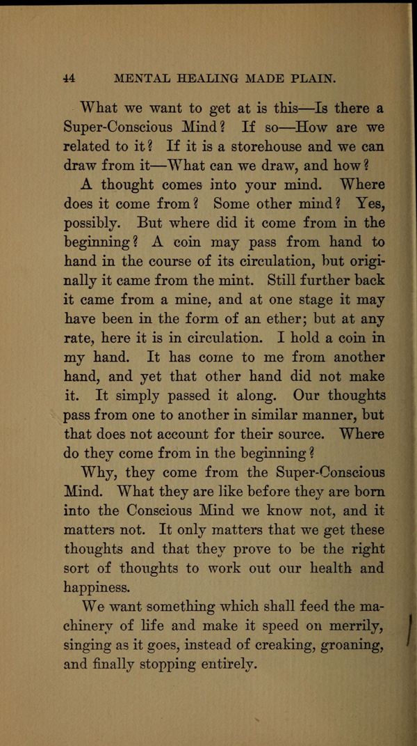 A thought comes into your mind. Where does it come from? Some other mind? Yes, possibly. But where did it come from in the beginning? A coin may pass from hand to hand in the course of its circulation, but originally it came from the mint. Still further back it came from a mine, and at one stage it may have been in the form of an ether; but at any rate, here it is in circulation. I hold a coin in my hand. It has come to me from another hand, and yet that other hand did not make it. It simply passed it along. Our thoughts pass from one to another in similar manner, but that does not account for their source. Where do they come from in the beginning?