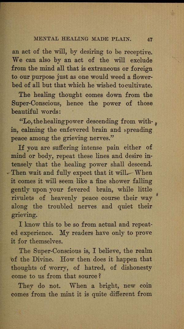 The healing thought comes down from the Super-Conscious, hence the power of those beautiful words: