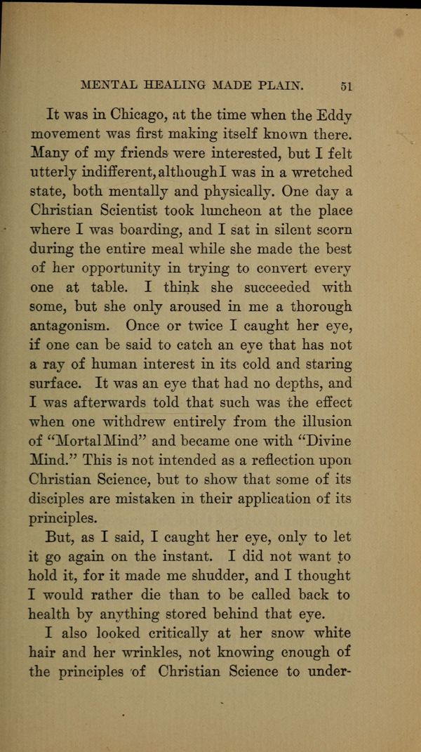 Many of my friends were interested, but I felt utterly indifferent, although I was in a wretched state, both mentally and physically. One day a Christian Scientist took luncheon at the place where I was boarding, and I sat in silent scorn during the entire meal while she made the best of her opportunity in trying to convert every one at table. I think she succeeded with some, but she only aroused in me a thorough antagonism. Once or twice I caught her eye, if one can be said to catch an eye that has not a ray of human interest in its cold and staring surface. It was an eye that had no depths, and I was afterwards told that such was the effect when one withdrew entirely from the illusion of "-Mortal Mind" and became one with "Divine Mind." This is not intended as a reflection upon Christian Science, but to show that some of its disciples are mistaken in their application of its principles.