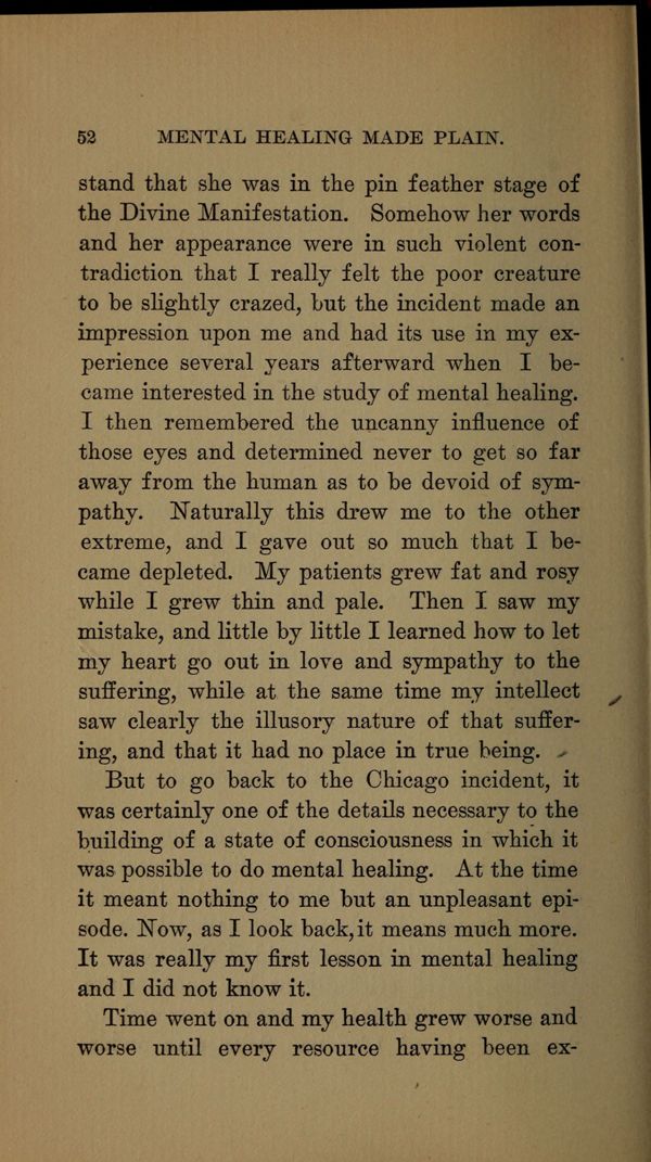 But to go back to the Chicago incident, it was certainly one of the details necessary to the building of a state of consciousness in which it was possible to do mental healing. At the time it meant nothing to me but an unpleasant episode. Now, as I look back, it means much more. It was really my first lesson in mental healing and I did not know it.