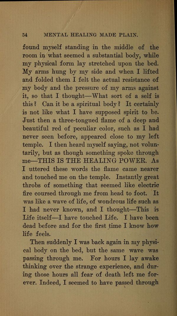 Just then a three-tongued flame of a deep and beautiful red of peculiar color, such as I had never seen before, appeared close to my left temple. I then heard myself saying, not voluntarily, but as though something spoke through me -- THIS IS THE HEALING POWER. As I uttered these words the flame came nearer and touched me on the temple. Instantly great throbs of something that seemed like electric fire coursed through me from head to foot. It was like a wave of life, of wondrous life such as I had never known, and I thought This is Life itself I have touched Life. I have been dead before and for the first time I know how life feels.