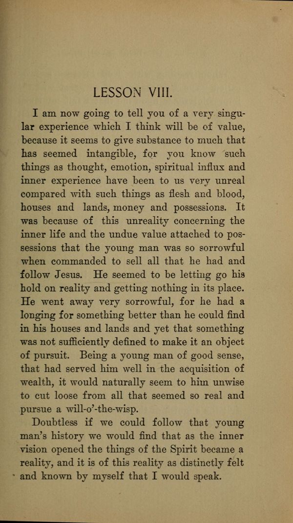 I am now going to tell you of a very singular experience which I think will be of value, because it seems to give substance to much that has seemed intangible, for you know such things as thought, emotion, spiritual influx and inner experience have been to us very unreal compared with such things as flesh and blood, houses and lands, money and possessions. It was because of this unreality concerning the inner life and the undue value attached to possessions that the young man was so sorrowful when commanded to sell all that he had and follow Jesus. He seemed to be letting go his hold on reality and getting nothing in its place.
