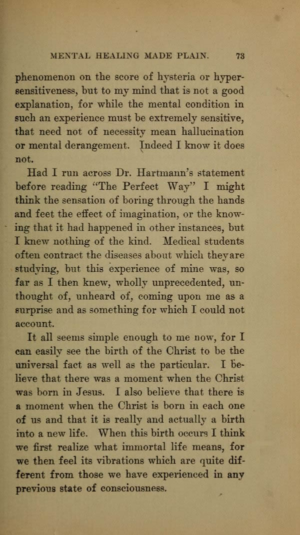 Had I run across Dr. Hartmann's statement before reading "The Perfect Way" I might think the sensation of boring through the hands and feet the effect of imagination, or the knowing that it had happened in other instances, but I knew nothing of the kind. Medical students often contract the diseases about which they are studying, but this experience of mine was, so far as I then knew, wholly unprecedented, unthought of, unheard of, coming upon me as a surprise and as something for which I could not account.