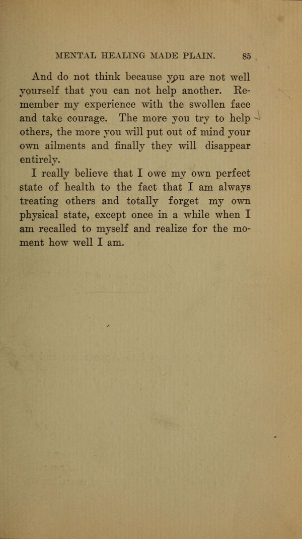 And do not think because you are not well yourself that you can not help another. Remember my experience with the swollen face and take courage. The more you try to help others, the more you will put out of mind your own ailments and finally they will disappear entirely.
