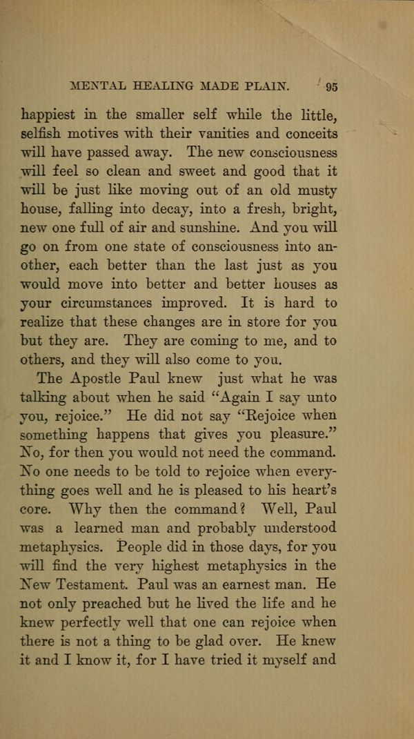 happiest in the smaller self while the little, selfish motives with their vanities and conceits will have passed away. The new consciousness will feel so clean and sweet and good that it will be just like moving out of an old musty house, falling into decay, into a fresh, bright, new one full of air and sunshine. And you will go on from one state of consciousness into another, each better than the last just as you would move into better and better houses as your circumstances improved. It is hard to realize that these changes are in store for you but they are. They are coming to me, and to others, and they will also come to you.
