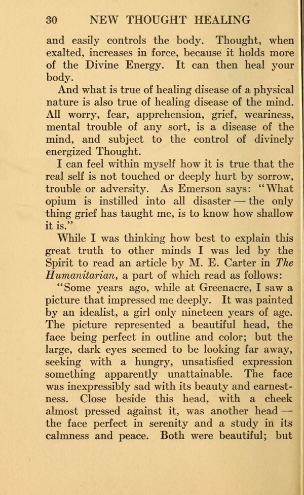 "Some years ago, while at Greenacre, I saw a picture that impressed me deeply. It was painted by an idealist, a girl only nineteen years of age. The picture represented a beautiful head, the face being perfect in outline and color; but the large, dark eyes seemed to be looking far away, seeking with a hungry, unsatisfied expression something apparently unattainable. The face was inexpressibly sad with its beauty and earnestness. Close beside this head, with a cheek almost pressed against it, was another head the face perfect in serenity and a study in its calmness and peace. Both were beautiful; but
