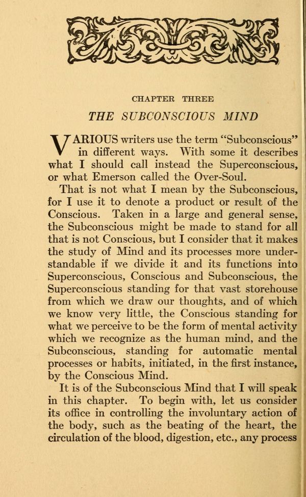 It is of the Subconscious Mind that I will speak in this chapter. To begin with, let us consider its office in controlling the involuntary action of the body, such as the beating of the heart, the circulation of the blood, digestion, etc., any process