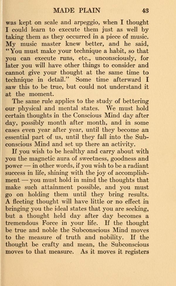 The same rule applies to the study of bettering our physical and mental states. We must hold certain thoughts in the Conscious Mind day after day, possibly month after month, and in some cases even year after year, until they become an essential part of us, until they fall into the Subconscious Mind and set up there an activity.