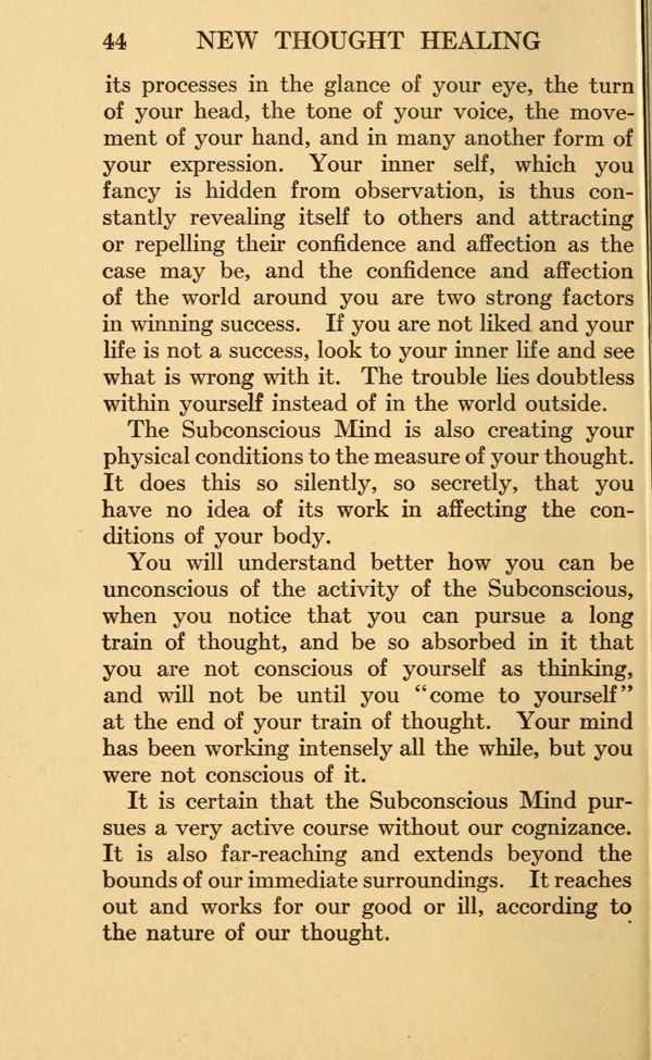 It is certain that the Subconscious Mind pursues a very active course without our cognizance. It is also far-reaching and extends beyond the bounds of our immediate surroundings. It reaches out and works for our good or ill, according to the nature of our thought.