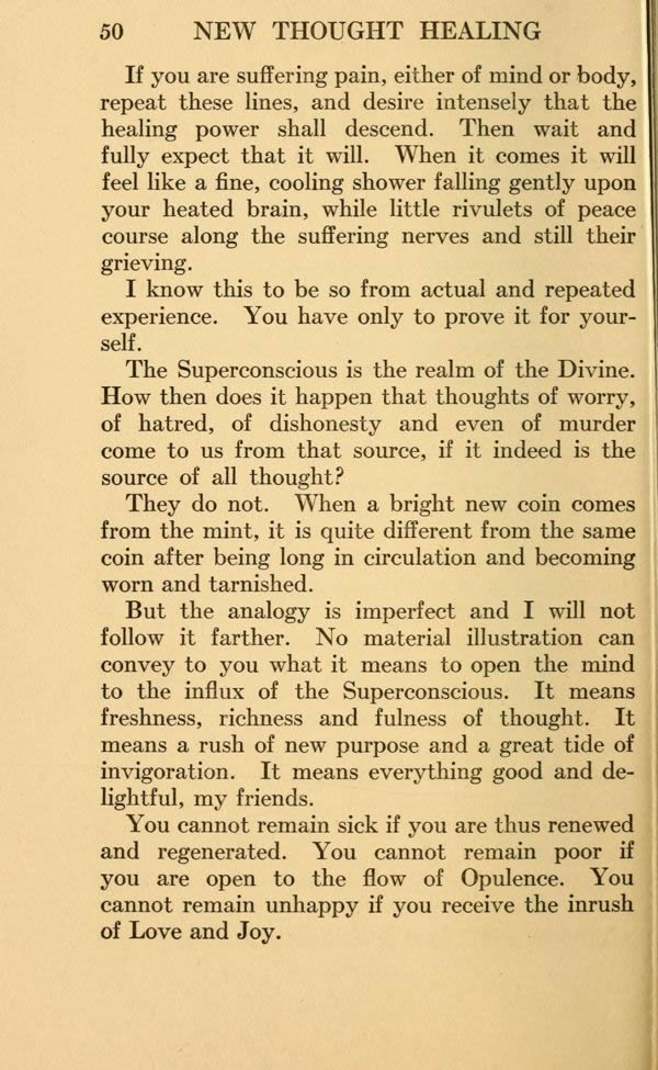 But the analogy is imperfect and I will not follow it farther. No material illustration can convey to you what it means to open the mind to the influx of the Superconscious. It means freshness, richness and fullness of thought. It means a rush of new purpose and a great tide of invigoration. It means everything good and delightful, my friends.