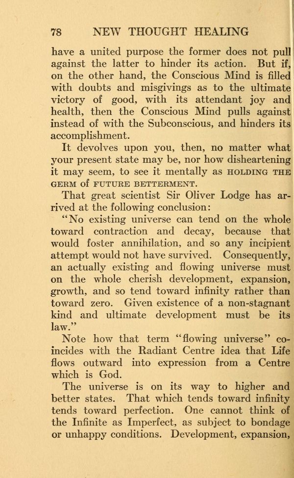 It devolves upon you, then, no matter what your present state may be, nor how disheartening it may seem, to see it mentally as HOLDING THE GERM Of FUTURE BETTERMENT. That great scientist Sir Oliver Lodge has arrived at the following conclusion: