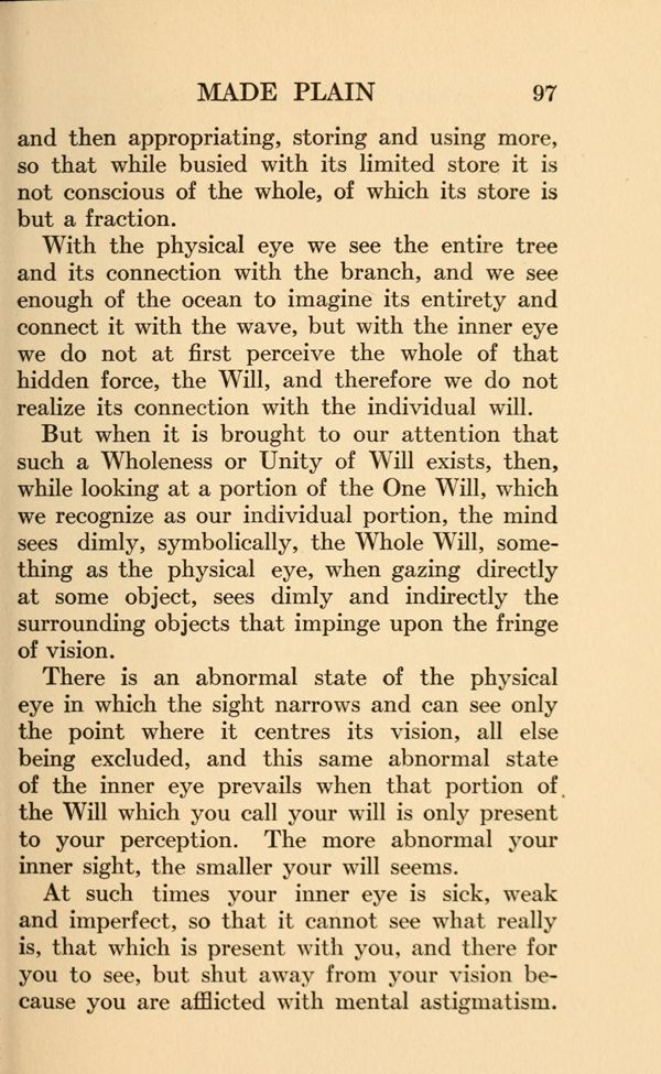 With the physical eye we see the entire tree and its connection with the branch, and we see enough of the ocean to imagine its entirety and connect it with the wave, but with the inner eye we do not at first perceive the whole of that hidden force, the Will, and therefore we do not realize its connection with the individual will. But when it is brought to our attention that such a Wholeness or Unity of Will exists, then, while looking at a portion of the One Will, which we recognize as our individual portion, the mind sees dimly, symbolically, the Whole Will, something as the physical eye, when gazing directly at some object, sees dimly and indirectly the surrounding objects that impinge upon the fringe of vision.