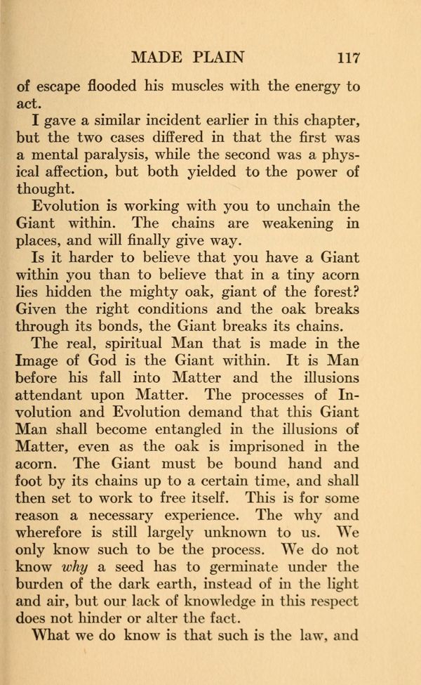 Given the right conditions and the oak breaks through its bonds, the Giant breaks its chains. The real, spiritual Man that is made in the Image of God is the Giant within. It is Man before his fall into Matter and the illusions attendant upon Matter. The processes of Involution and Evolution demand that this Giant Man shall become entangled in the illusions of Matter, even as the oak is imprisoned in the acorn. The Giant must be bound hand and foot by its chains up to a certain time, and shall then set to work to free itself. This is for some reason a necessary experience. The why and wherefore is still largely unknown to us. We only know such to be the process. We do not know why a seed has to germinate under the burden of the dark earth, instead of in the light and air, but our lack of knowledge in this respect does not hinder or alter the fact.