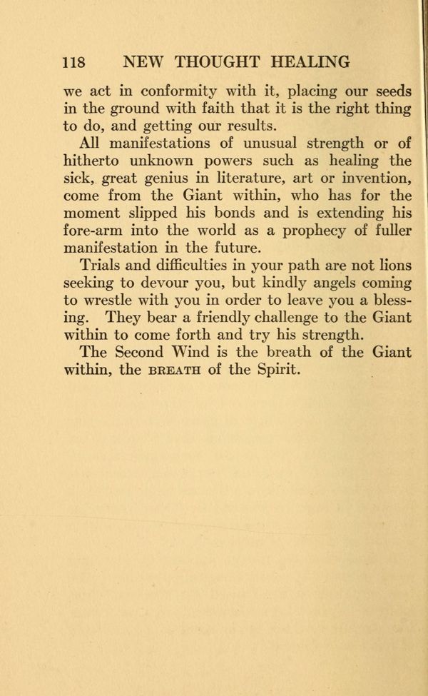 Trials and difficulties in your path are not lions seeking to devour you, but kindly angels coming to wrestle with you in order to leave you a blessing. They bear a friendly challenge to the Giant within to come forth and try his strength. The Second Wind is the breath of the Giant within, the BREATH of the Spirit.
