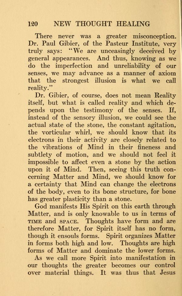 Dr. Gibier, of course, does not mean Reality itself, but what is called reality and which depends upon the testimony of the senses. If, instead of the sensory illusion, we could see the actual state of the stone, the constant agitation, the vorticular whirl, we should know that its electrons in their activity are closely related to the vibrations of Mind in their fineness and subtlety of motion, and we should not feel it impossible to affect even a stone by the action upon it of Mind. Then, seeing this truth concerning Matter and Mind, we should know for a certainty that Mind can change the electrons of the body, even to its bone structure, for bone has greater plasticity than a stone.