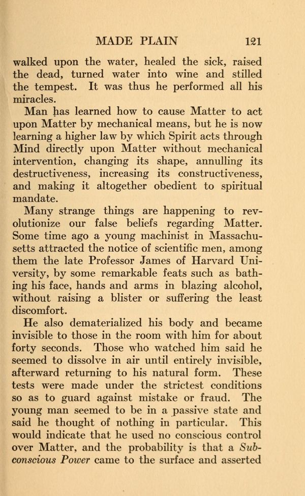 He also dematerialized his body and became invisible to those in the room with him for about forty seconds. Those who watched him said he seemed to dissolve in air until entirely invisible, afterward returning to his natural form. These tests were made under the strictest conditions so as to guard against mistake or fraud. The young man seemed to be in a _passive state and said he thought of nothing in particular. This would indicate that he used no conscious control over Matter, and the probability is that a Subconscious Power came to the surface and asserted