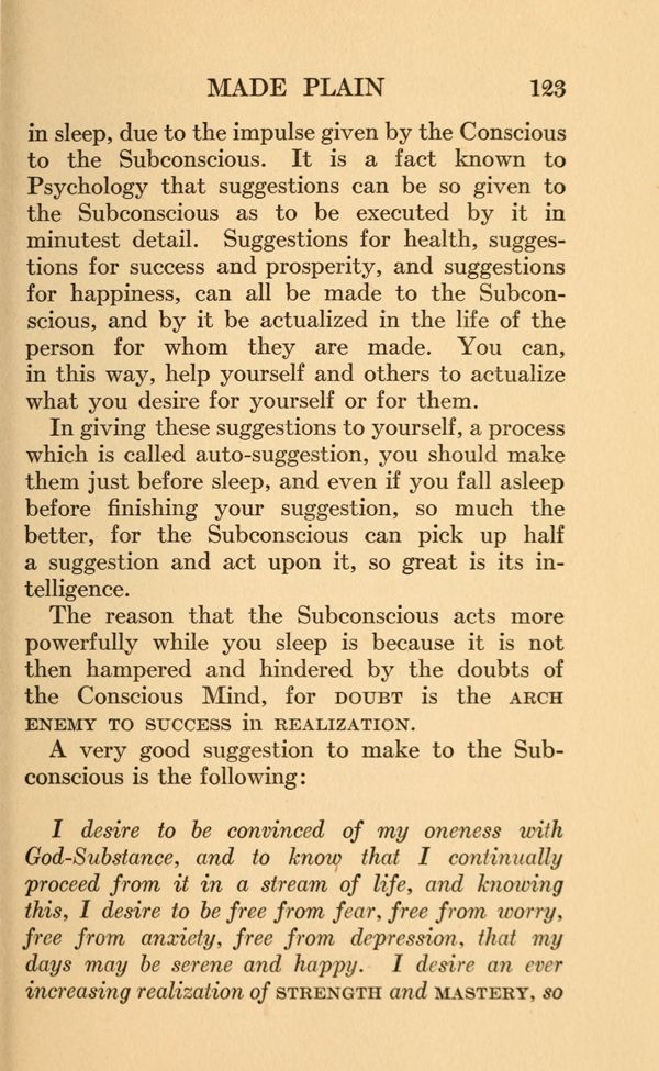 In giving these suggestions to yourself, a process which is called auto-suggestion, you should make them just before sleep, and even if you fall asleep before finishing your suggestion, so much the better, for the Subconscious can pick up half a suggestion and act upon it, so great is its intelligence. The reason that the Subconscious acts more powerfully while you sleep is because it is not then hampered and hindered by the doubts of the Conscious Mind, for DOUBT is the ARCH ENEMY TO SUCCESS in REALIZATION. A very good suggestion to make to the Subconscious is the following: