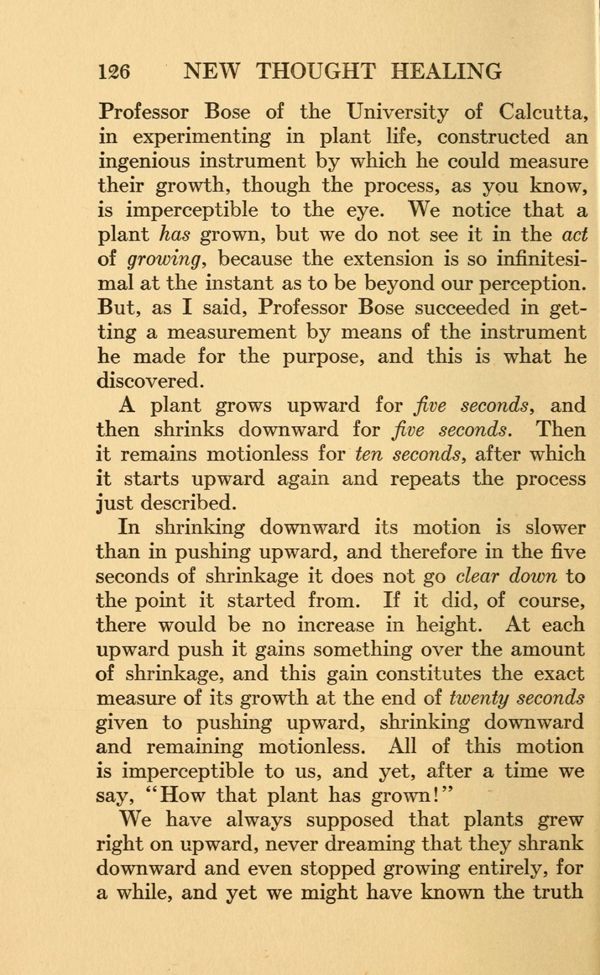Professor Bose of the University of Calcutta, in experimenting in plant life, constructed an ingenious instrument by which he could measure their growth, though the process, as you know, is imperceptible to the eye. We notice that a plant has grown, but we do not see it in the act of growing, because the extension is so infinitesimal at the instant as to be beyond our perception.