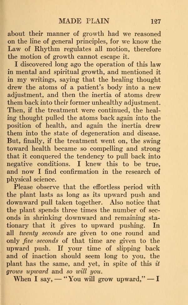 Then, if the treatment were continued, the healing thought pulled the atoms back again into the position of health, and again the inertia drew them into the state of degeneration and disease. But, finally, if the treatment went on, the swing toward health became so compelling and strong that it conquered the tendency to pull back into negative conditions. I knew this to be true, and now I find confirmation in the research of physical science.