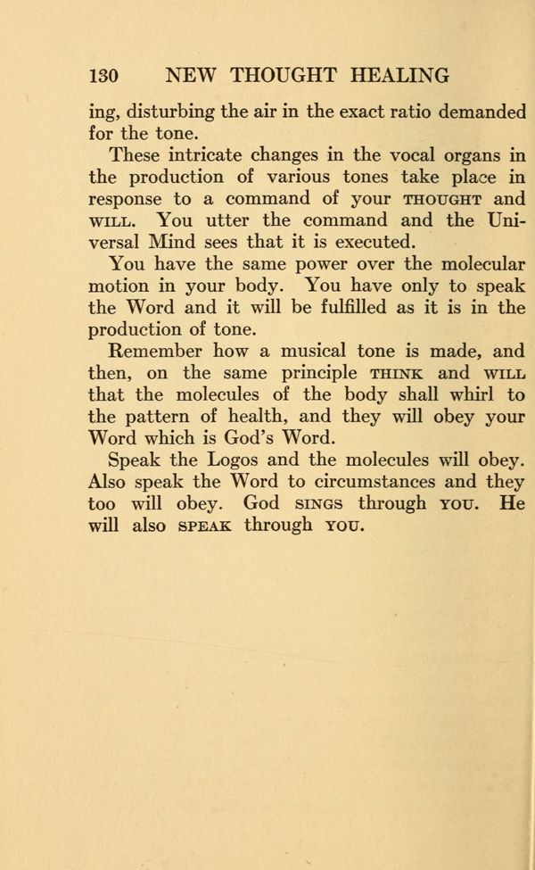 These intricate changes in the vocal organs in the production of various tones take place in response to a command of your THOUGHT and WILL. You utter the command and the Universal Mind sees that it is executed.