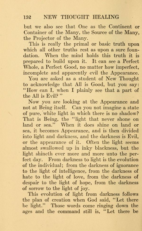 That is Being, the "light that never shone on land or sea." When it does shine on land or sea, it becomes Appearance, and is then divided into light and darkness, and the darkness is Evil, or the appearance of it. Often the light seems almost swallowed up in inky blackness, but the light shineth ever more and more unto the perfect day. From darkness to light is the evolution of the individual; from the darkness of ignorance to the light of intelligence, from the darkness of hate to the light of love, from the darkness of despair to the light of hope, from the darkness of sorrow to the light of joy.