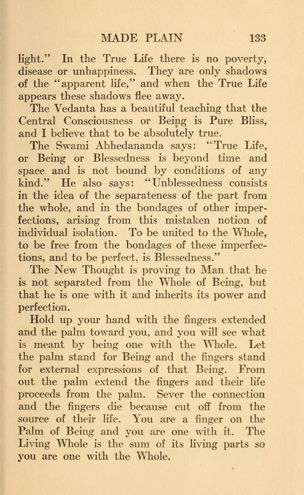 Hold up your hand with the fingers extended and the palm toward you, and you will see what is meant by being one with the Whole. Let the palm stand for Being and the fingers stand for external expressions of that Being. From out the palm extend the fingers and their life proceeds from the palm. Sever the connection and the fingers die because cut off from the source of their life. You are a finger on the Palm of Being and you are one with it. The Living Whole is the sum of its living parts so you are one with the Whole.