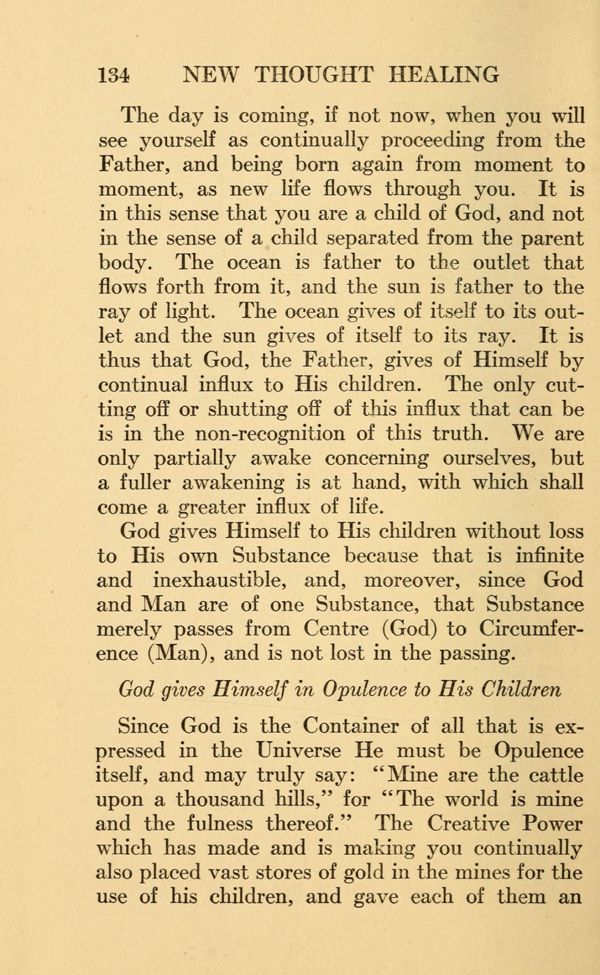 The day is coming, if not now, when you will see yourself as continually proceeding from the Father, and being born again from moment to moment, as new life flows through you. It. is in this sense that you are a child of God, and not in the sense of a child separated from the parent body. The ocean is father to the outlet that flows forth from it, and the sun is father to the ray of light. The ocean gives of itself to its outlet and the sun gives of itself to its ray. It is thus that God, the Father, gives of Himself by continual influx to His children. The only cutting of or shutting off of this influx that can be is in the non-recognition of this truth. We are only partially awake concerning ourselves, but a fuller awakening is at hand, with which shall come a greater influx of life.