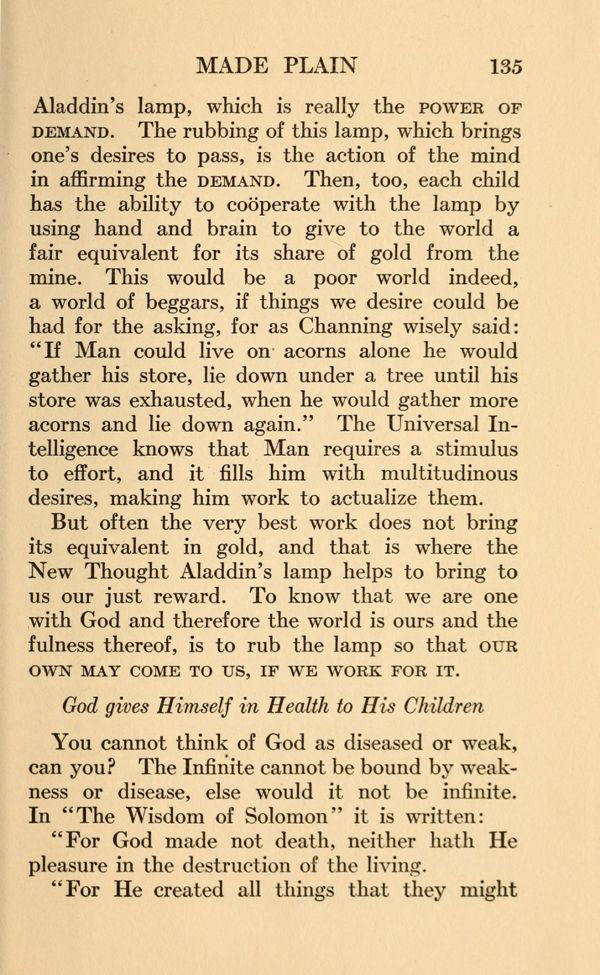 Aladdin's lamp, which is really the POWER OF DEMAND. The rubbing of this lamp, which brings one's desires to pass, is the action of the mind in affirming the DEMAND. Then, too, each child has the ability to cooperate with the lamp by using hand and brain to give to the world a fair equivalent for its share of gold from the mine. This would be a poor world indeed, a world of beggars, if things we desire could be had for the asking, for as Channing wisely said: