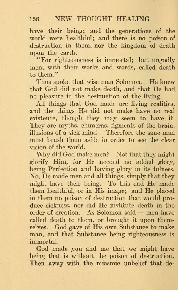 Why did God make men? Not that they might glorify Him, for He needed no added glory, being Perfection and having glory in its fulness. No, He made men and all things, simply that they might have their being. To this end He made them healthful, or in His image; and He placed in them no poison of destruction that would produce sickness, nor did He institute death in the order of creation. As Solomon said — men have called death to them, or brought it upon themselves. God gave of His own Substance to make man, and that Substance being righteousness is immortal.