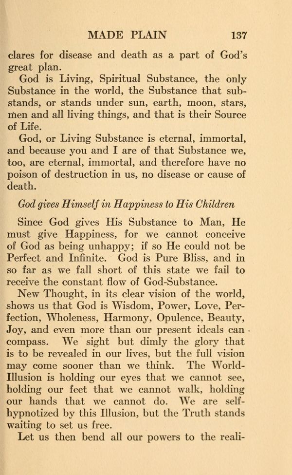Since God gives His Substance to Man, He must give Happiness, for we cannot conceive of God as being unhappy; if so He could not be Perfect and Infinite. God is Pure Bliss, and in so far as we fall short of this state we fail to receive the constant flow of God-Substance.