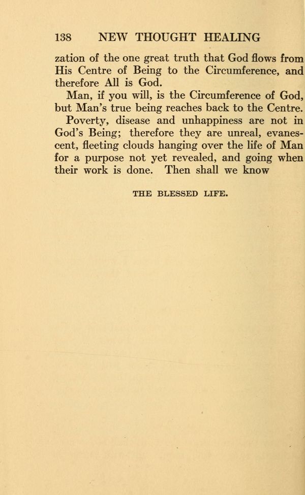 Man, if you will, is the Circumference of God, but Man's true being reaches back to the Centre. Poverty, disease and unhappiness are not in God's Being; therefore they are unreal, evanescent, fleeting clouds hanging over the life of Man for a purpose not yet revealed, and going when their work is done. Then shall we know