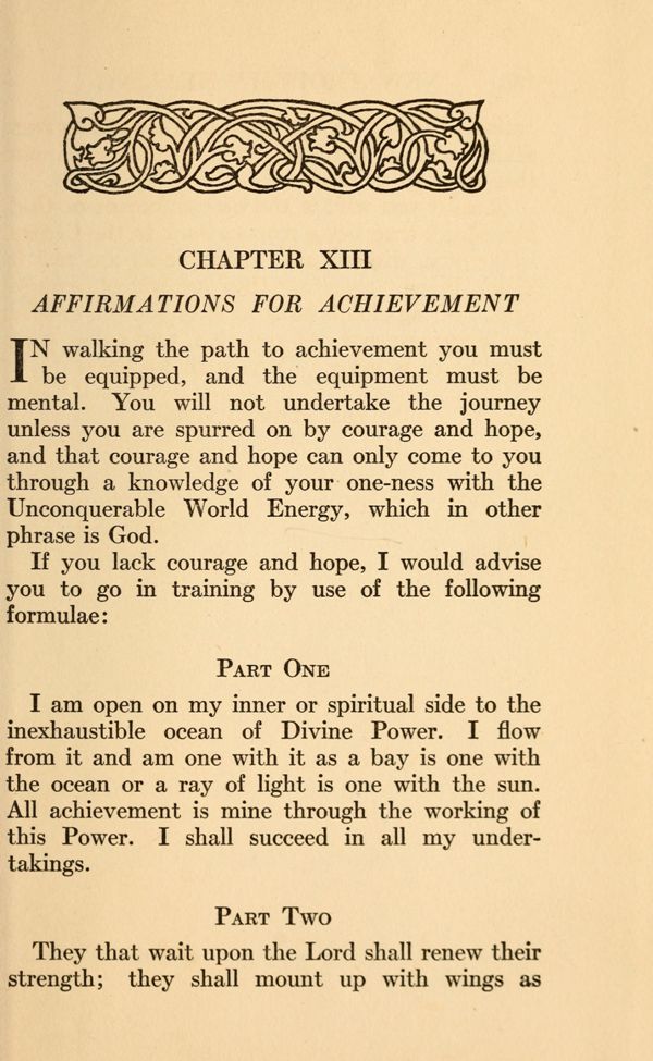 IN walking the path to achievement you must be equipped, and the equipment must be mental. You will not undertake the journey unless you are spurred on by courage and hope, and that courage and hope can only come to you through a knowledge of your one-ness with the Unconquerable World Energy, which in other phrase is God.