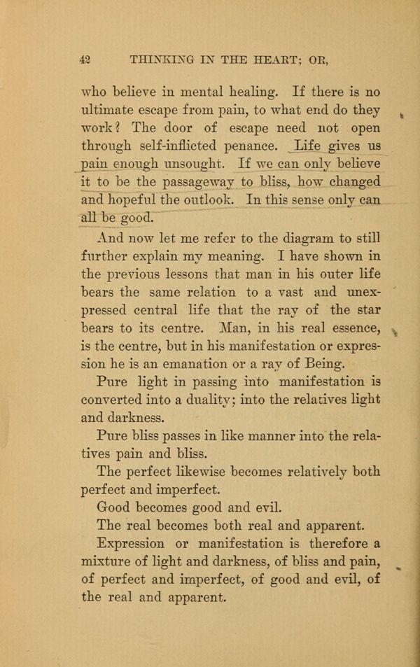 who believe in mental healing. If there is no ultimate escape from pain, to what end do they work? The door of escape need not open through self-inflicted penance. Life gives us pain enough unsought. If we can only believe it to be the passageway to bliss, how changed and hopeful the outlook. In this sense only can all be good.