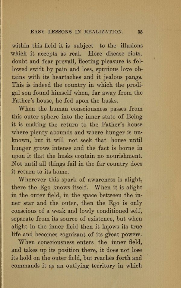 within this field it is subject to the illusions which it accepts as real. Here disease riots, doubt and fear prevail, fleeting pleasure is followed swift by pain and loss, spurious love obtains with its heartaches and it jealous pangs. This is indeed the country in which the prodigal son found himself when, far away from the Father's house, he fed upon the husks.