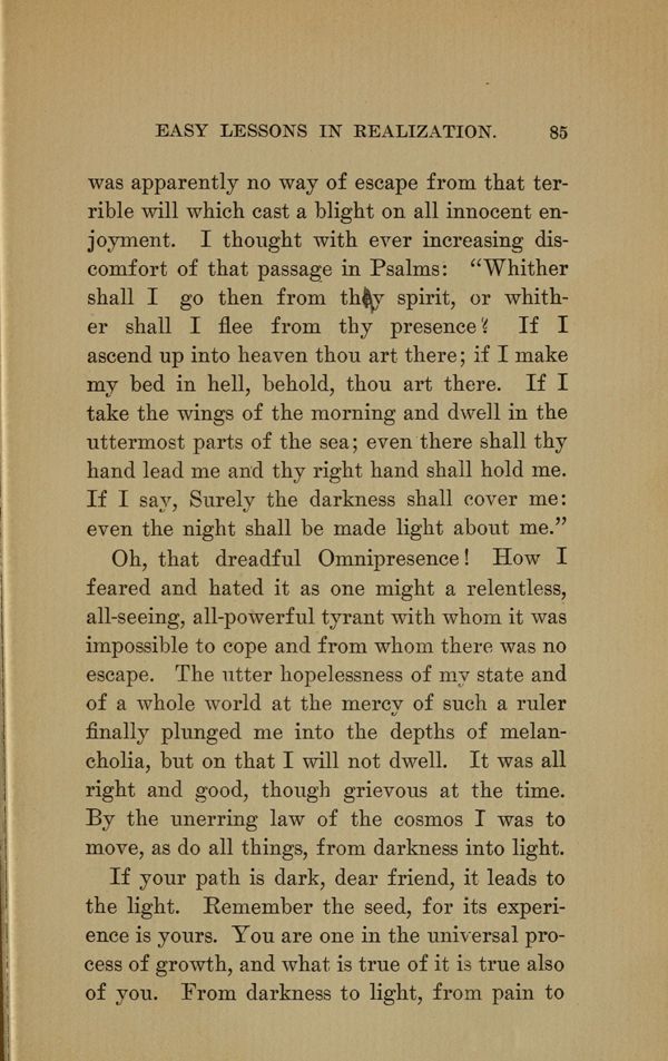 If I say, Surely the darkness shall cover me: even the night shall be made light about me. Oh, that dreadful Omnipresence! now I feared and hated it as one might a relentless, all-seeing, all-powerful tyrant with whom it was impossible to cope and from whom there was no escape. The utter hopelessness of my state and of a whole world at the mercy of such a ruler finally plunged me into the depths of melancholia, but on that I will not dwell. It was all right and good, though grievous at the time. By the unerring law of the cosmos I was to move, as do all things, from darkness into light.