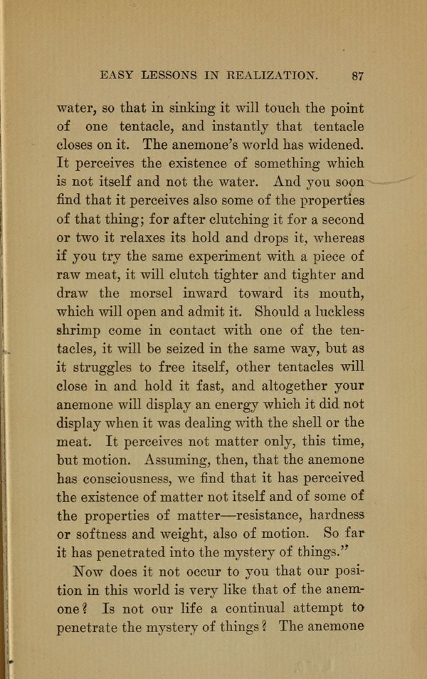 It perceives the existence of something which is not itself and not the water. And you soon find that it perceives also some of the properties of that thing; for after clutching it for a second or two it relaxes its hold and drops it, whereas if you try the same experiment with a piece of raw meat, it will clutch tighter and tighter and draw the morsel inward toward its mouth, which will open and admit it. Should a luckless shrimp come in contact with one of the tentacles, it will he seized in the same way, but as it struggles to free itself, other tentacles will close in and hold it fast, and altogether your anemone will display an energy which it did not display when it was dealing with the shell or the meat. It perceives not matter only, this time, but motion. Assuming, then, that the anemone has consciousness, we find that it has perceived the existence of matter not itself and of some of the properties of matter resistance, hardness or softness and weight, also of motion. So far it has penetrated into the mystery of things." Now does it not occur to you that our position in this world is very like that of the anemone? Is not our life a continual attempt to penetrate the mystery of things? The anemone