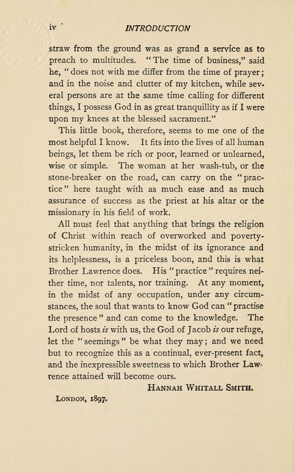 This little book, therefore, seems to me one of the most helpful I know. It fits into the lives of all human beings, let them be rich or poor, learned or unlearned, wise or simple. The woman at her wash-tub, or the stone-breaker on the road, can carry on the "practice" here taught with as much ease and as much assurance of success as the priest at his altar or the missionary in his field of work.